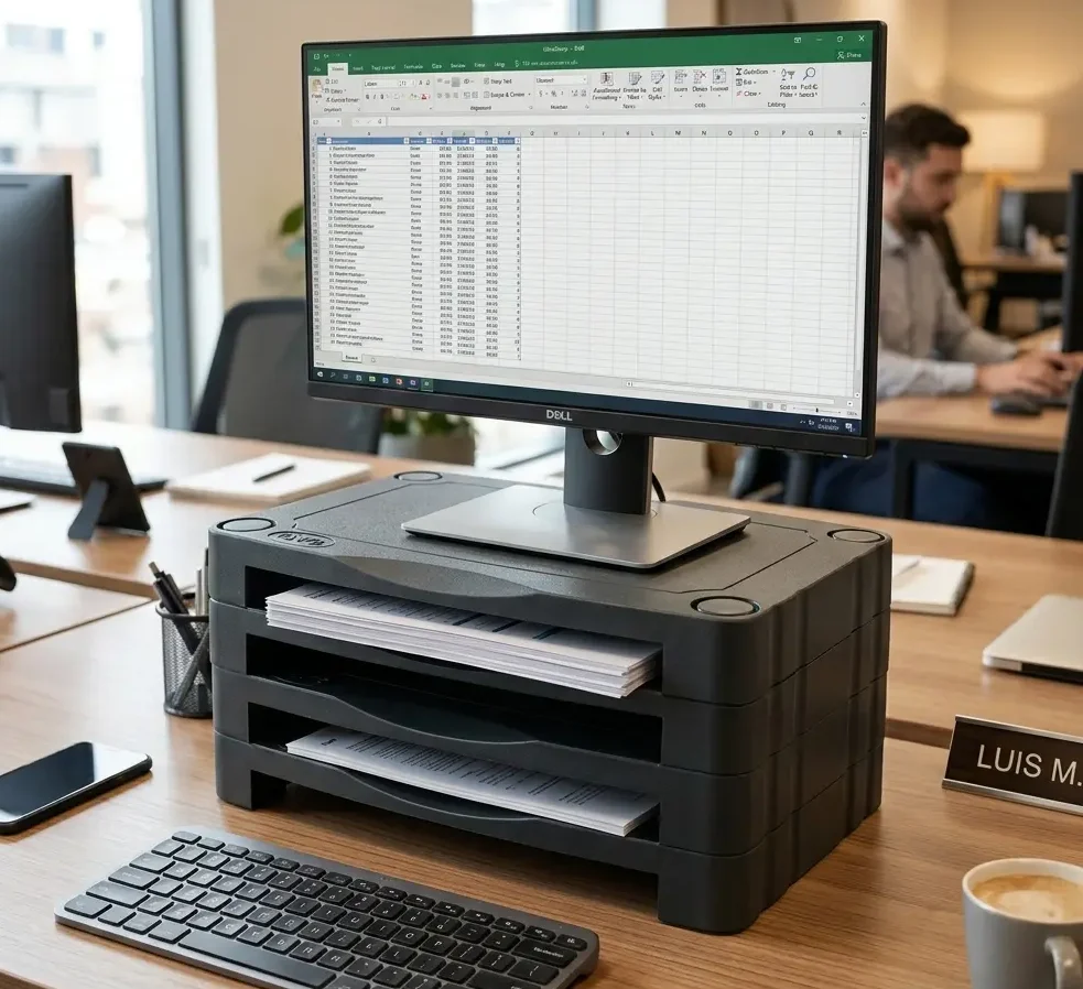 Soporte modular. Ajustable desde 3 cm hasta la altura deseada. Alturas 3,6,9 cm Con opción de ajustar a 12, 15, 18,21, 24, cm Espacio organizador de documentos optimizando espacio